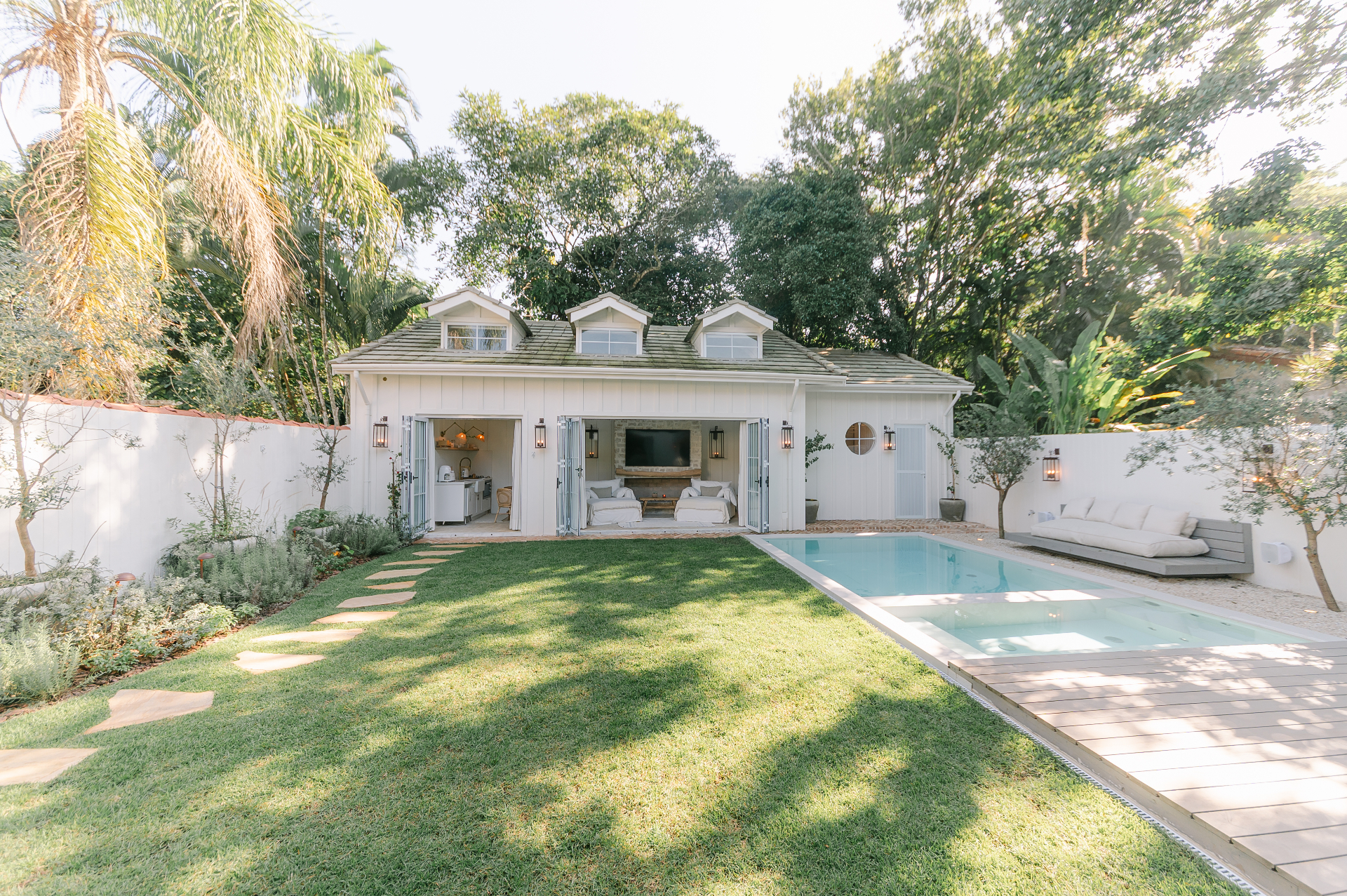 * Detalhes fofos e americanos como Farm sink, Torneira para encher panela no fogão, paredes em shiplap branco, paisagismo com oliveiras, lavandas e alecrim, luminárias em palha, colchas em linho, almofadas em cordas, tecidos naturais;